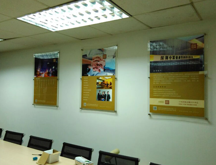 每套展板由2块透明合资亚克力板组成,中间夹画面。四周用广告钉固定在墙壁或者木板上。