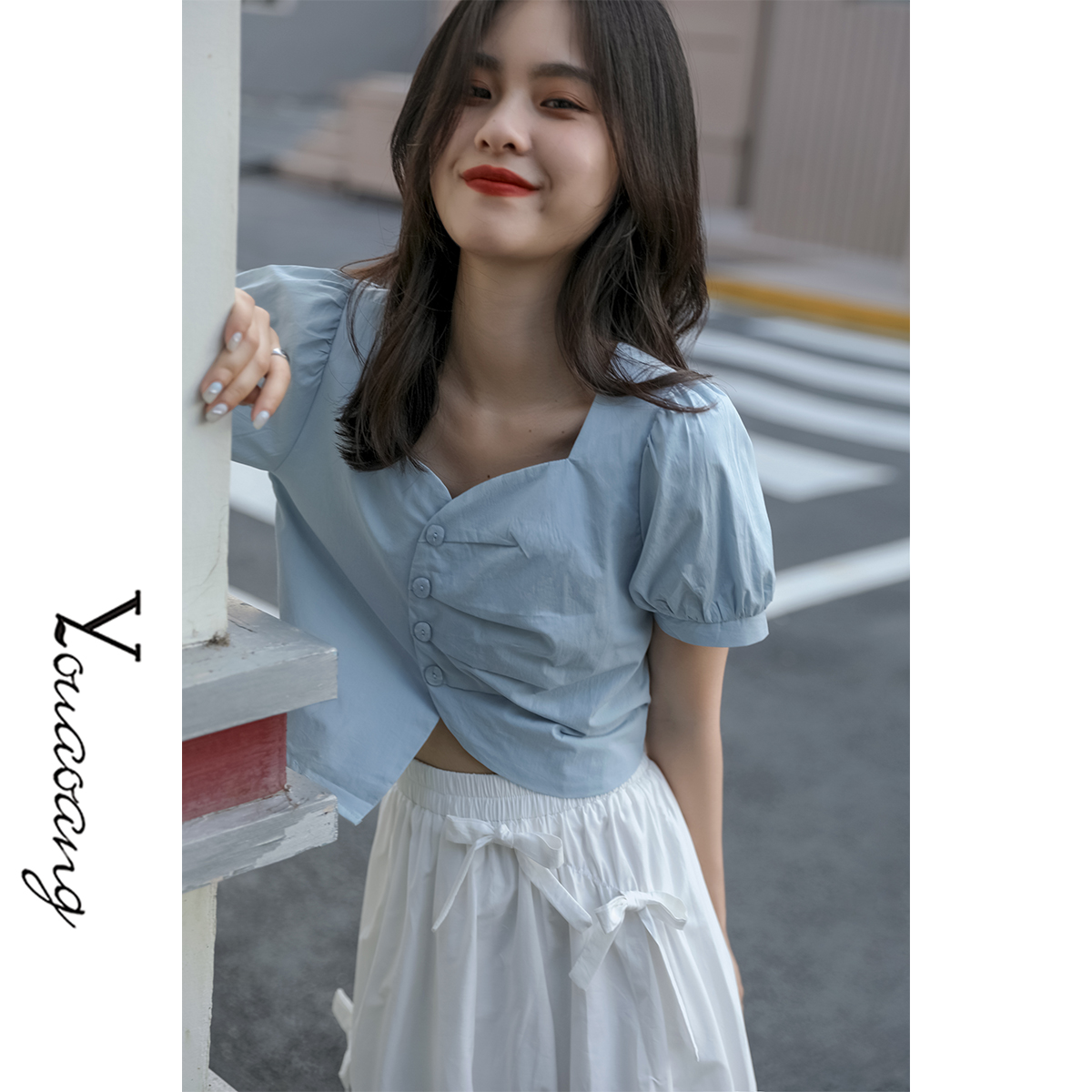 又巷2021蓝色设计感方领小众上衣t恤女夏衬衫短款女装新款潮热门设计联盟服务商