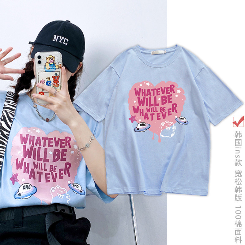 爱心纯棉短袖t恤女学生韩版宽松大码奶蓝色国潮小众设计感女上衣热门设计联盟服务商