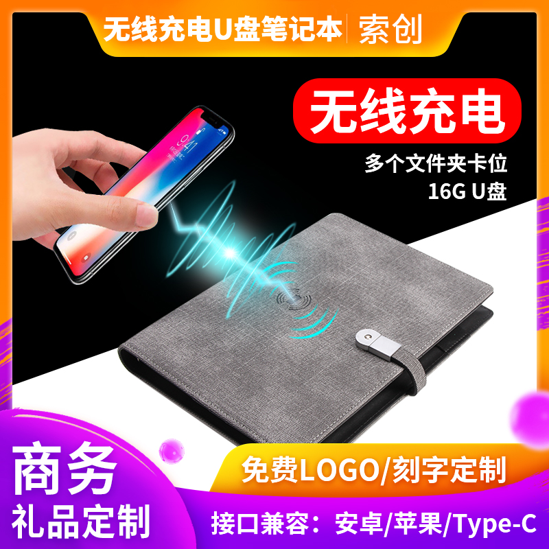 商务办公本U盘无线充电笔记本多功能移动电源活页记事本礼品定制A5活页套装会议记录本手账本企业定做logo热门设计联盟服务商