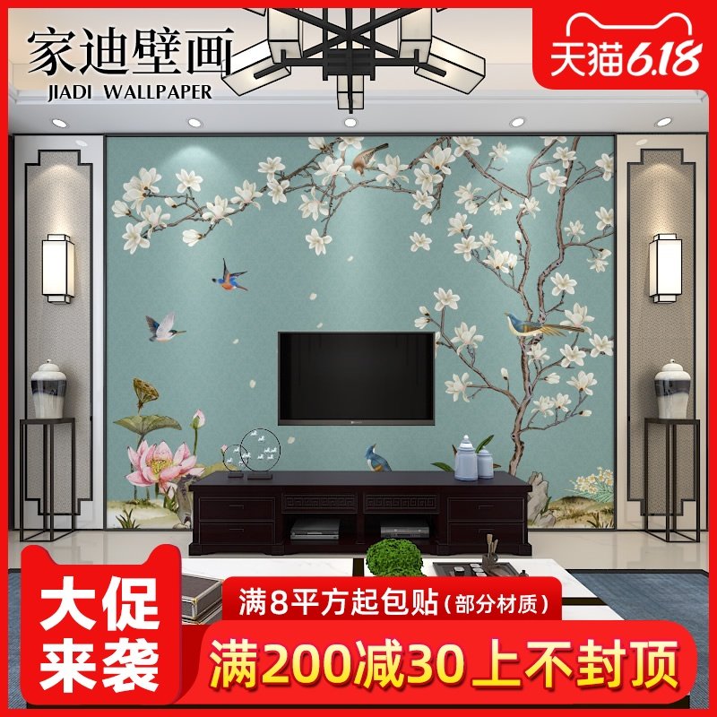 现代新中式花鸟墙纸电视背景墙壁纸卧室客厅3d无缝墙布影视墙壁画热门设计联盟服务商
