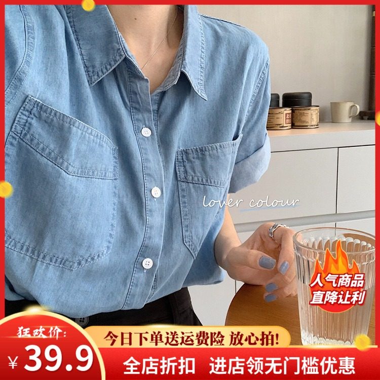 复古港味牛仔衬衫女薄款夏季宽松设计感小众上衣Polo领短袖衬衣潮热门设计联盟服务商
