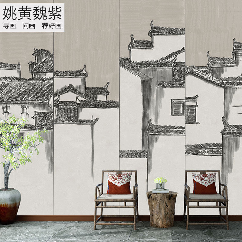 徽州建筑粉墙黛瓦来图定制国潮壁纸饭店酒楼商业空间高端壁布墙热门设计联盟服务商