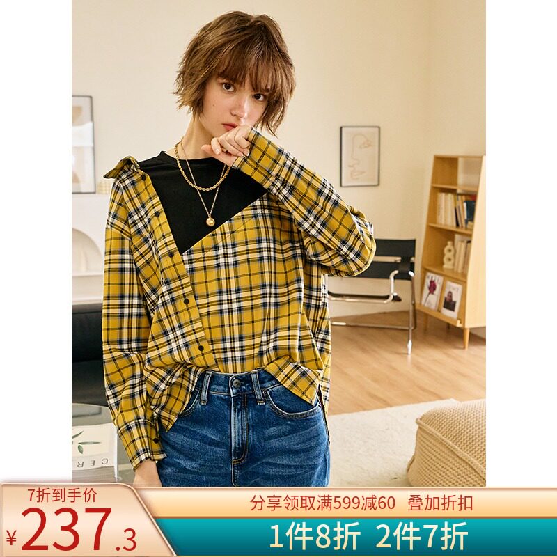 PPH●法系小众设计 招牌款 个性不规则露肩假两件格纹长袖衬衣女热门设计联盟服务商