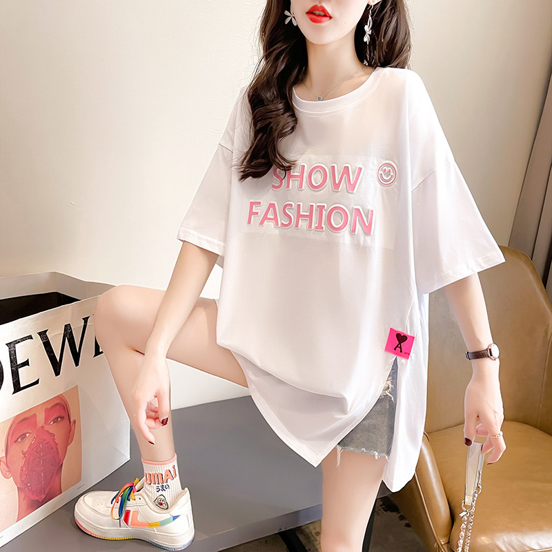 欧洲站设计感开叉中长款短袖T恤女装2021夏季新款大码宽松半袖潮热门设计联盟服务商