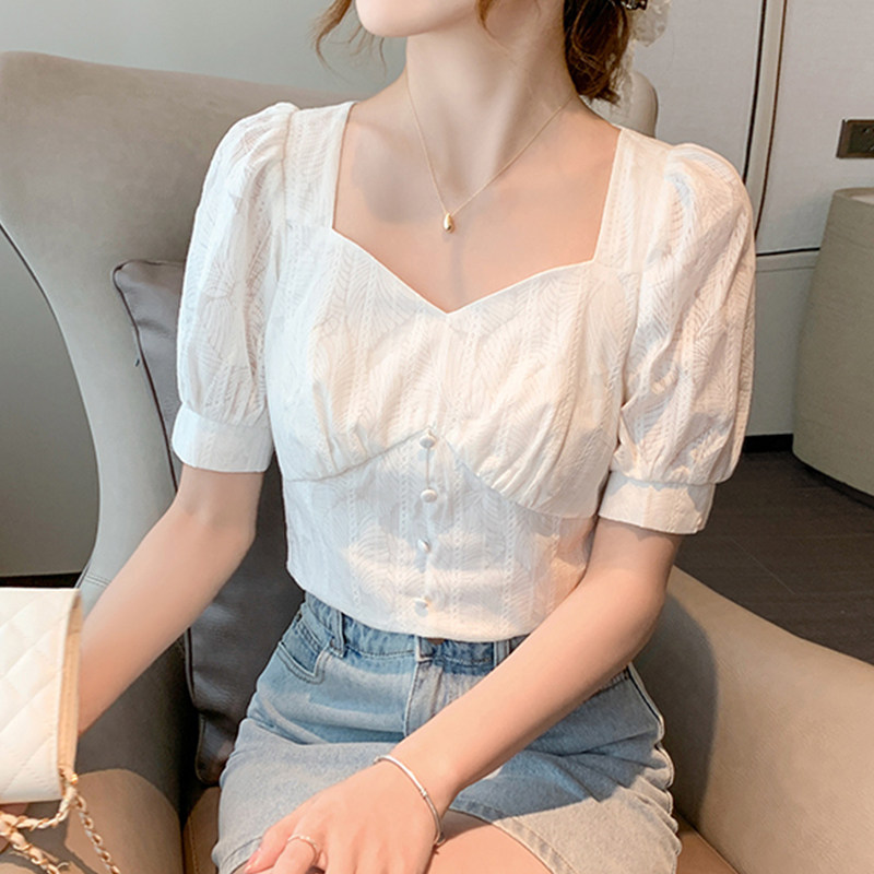 凌卡服饰工厂店方领法式上衣女雪纺衫设计感小众短袖白色短款复古热门设计联盟服务商