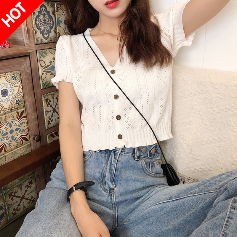 白色高腰上衣女短款V领针织衫短袖冰丝t恤夏季法式别致设计感小众热门设计联盟服务商